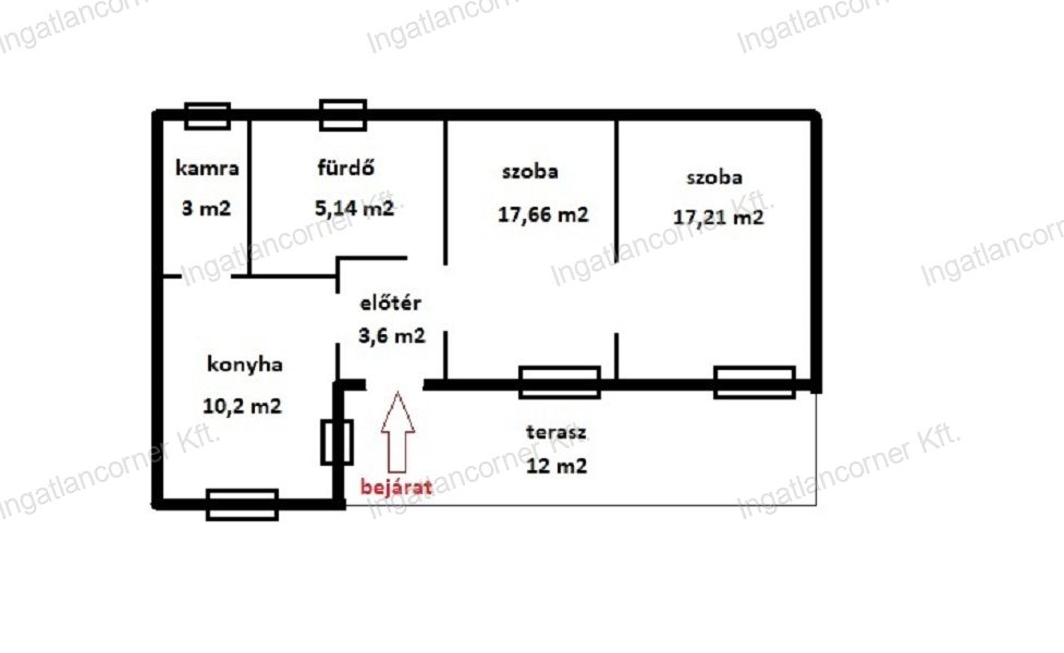• két közel azonos méretű szoba (17,66 m² és 17,21 m²),