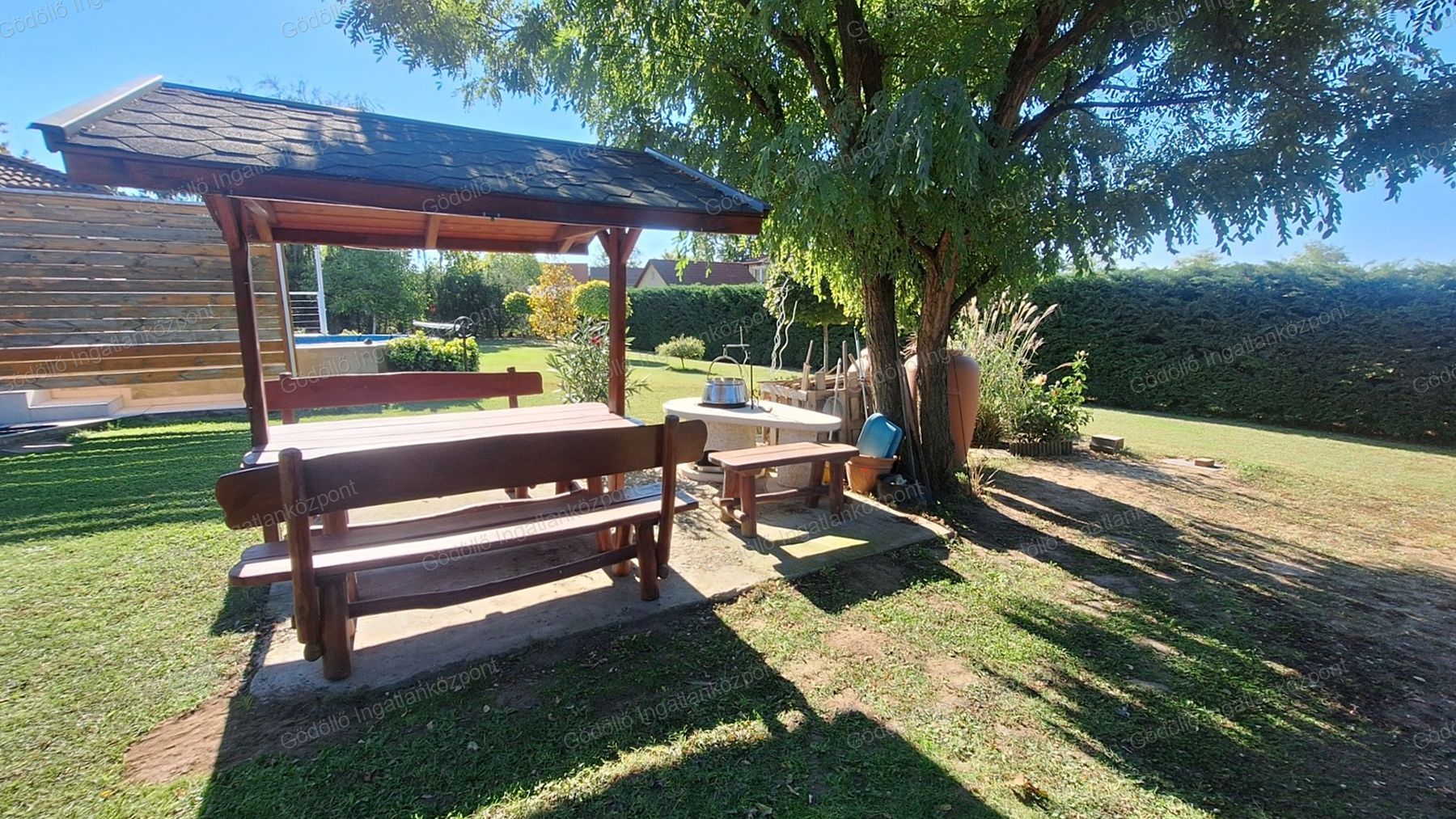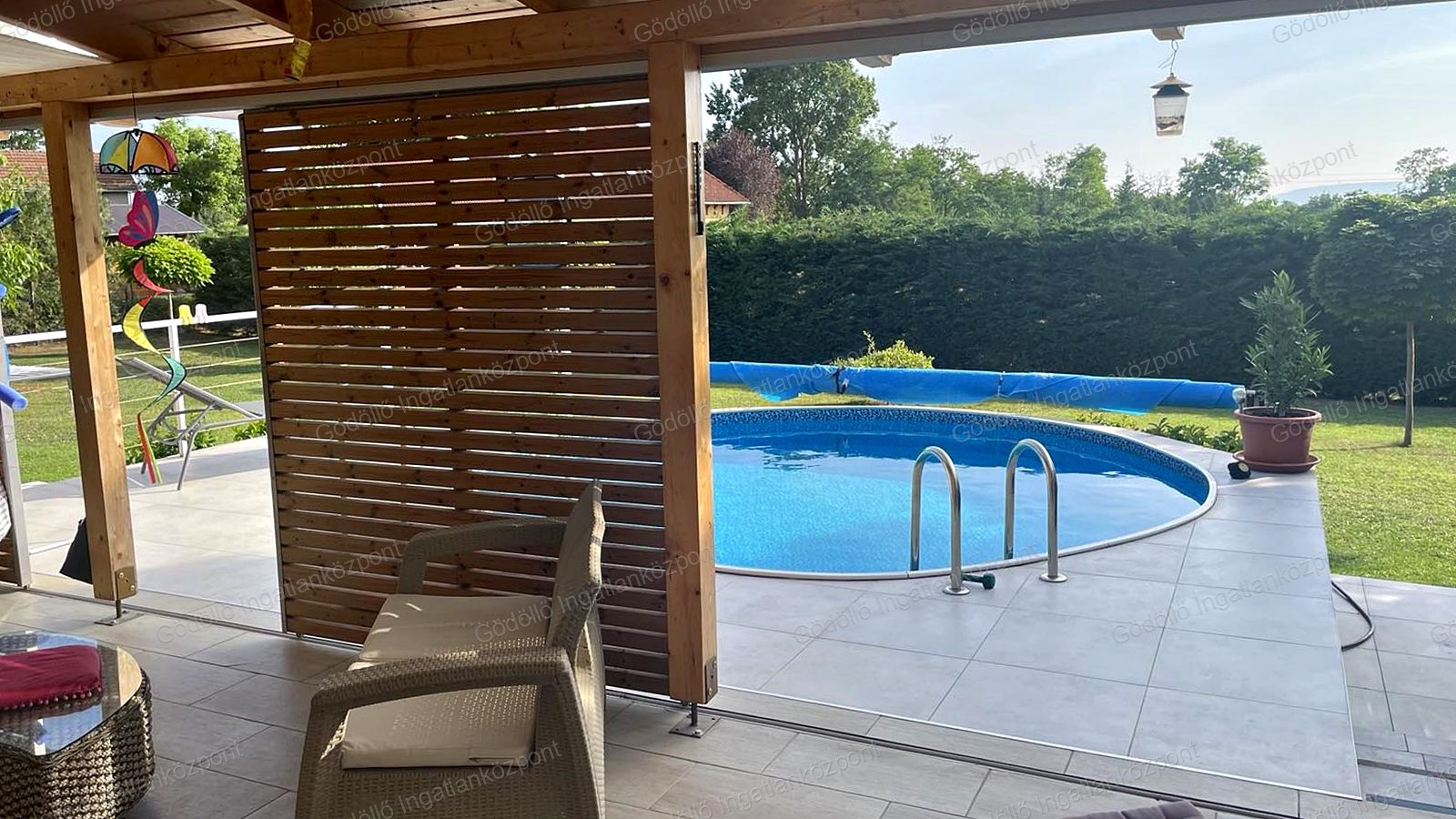 A házhoz 24nm-es fedett és 20nm-es nyitott, körmedencés terasz is tartozik. (Medence átmérője 4,6m, fűtése hőszivattyús).