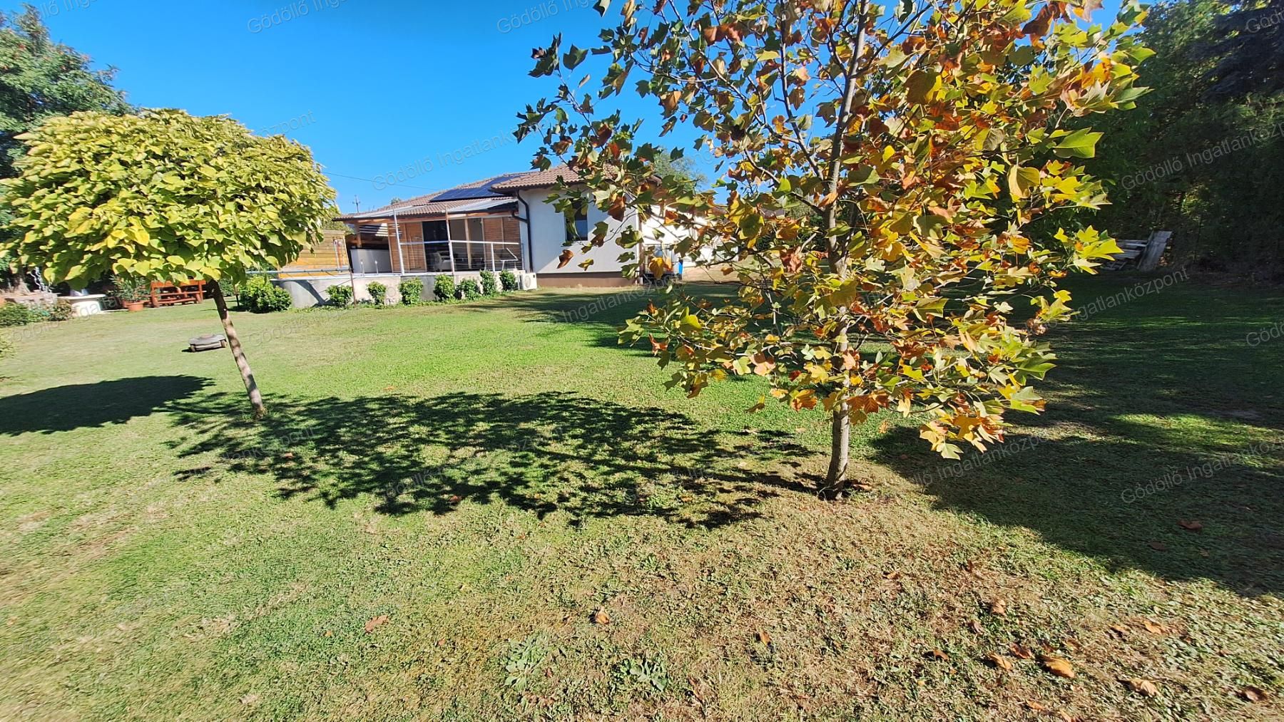 A 38m széles, 1870nm-es kocka formájú telek gondozásmentes kerítéssel lett ellátva. Parkosított udvarában fedett szaletli, kerti tároló és grillező kapott helyet, ill. a bejáratnál egy külső gardró/tároló is megtalálható. A fű nyírását Husqvarna robotfűnyíró, a növények locsolását 380m mély fúrt kút és öntözőrendszer (600m-en) látja el.