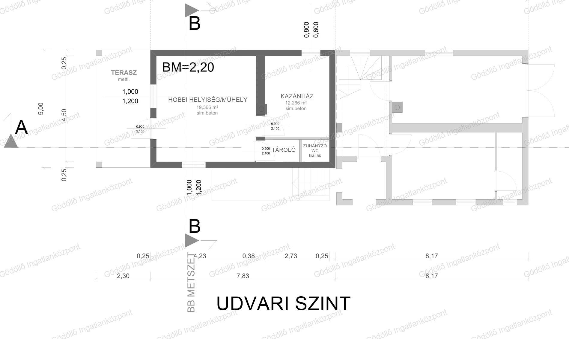 Kialakításra került benne előtér, nappali-konyha-étkező, kamra, 3 szoba, gardrób, két fürdőszoba, két wc, mosókonyha, hobbihelyiség, kazánház, tároló és 16nm garázs. Teraszai 15 és 17nm-esek.