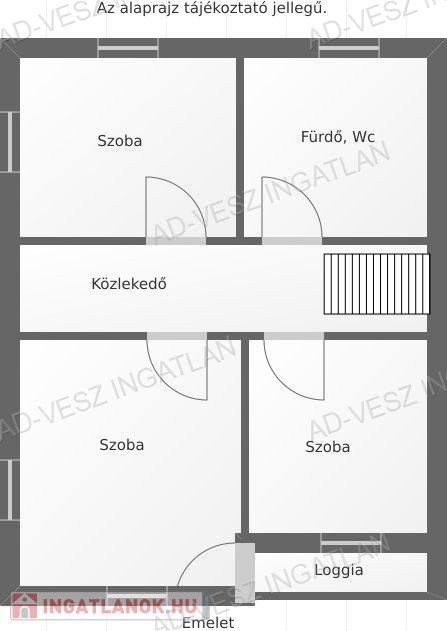 Az emeletre érve 3 külön bejáratú hálószobát, fürdőszobát, és közlekedőt találunk, valamint egy loggiát.