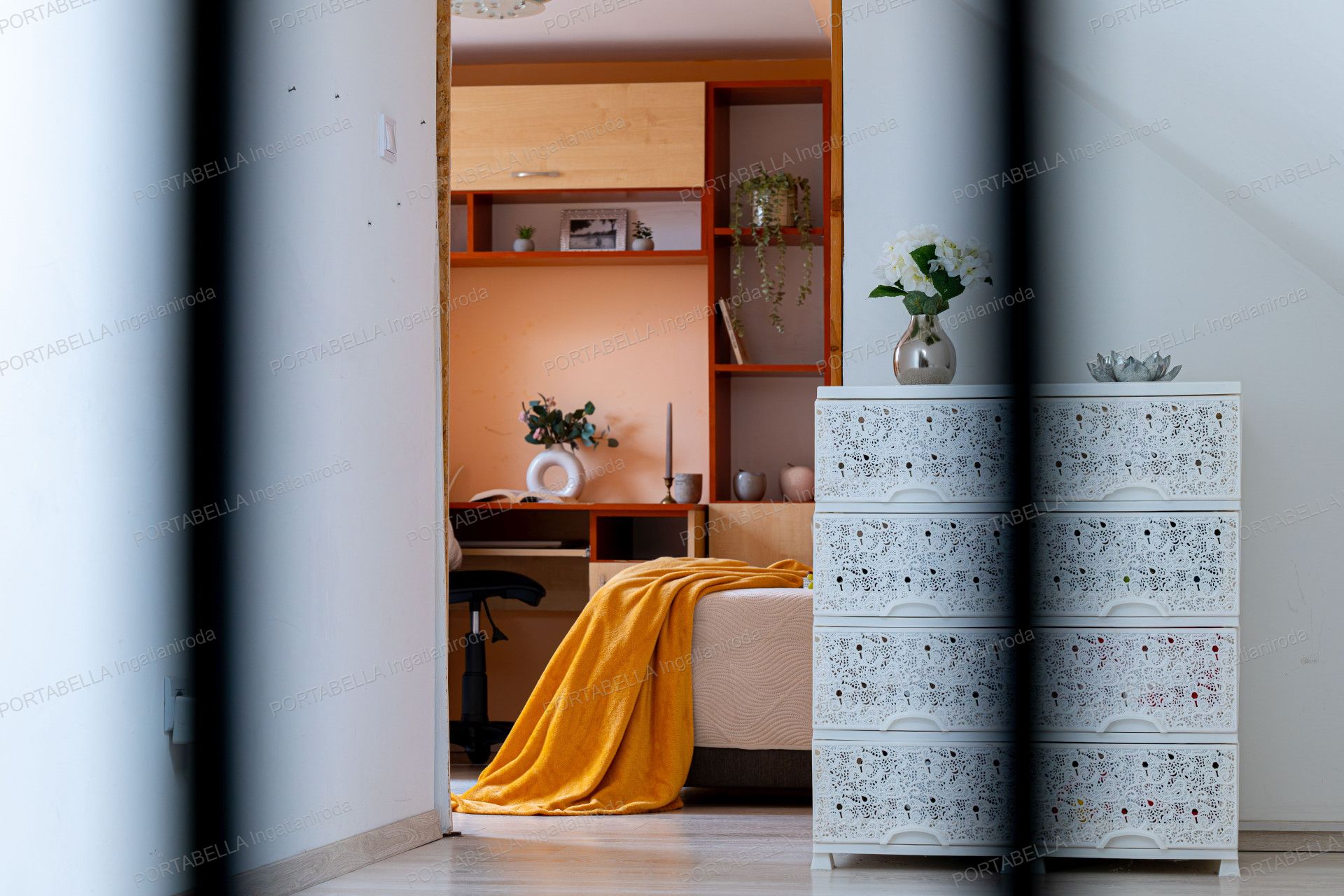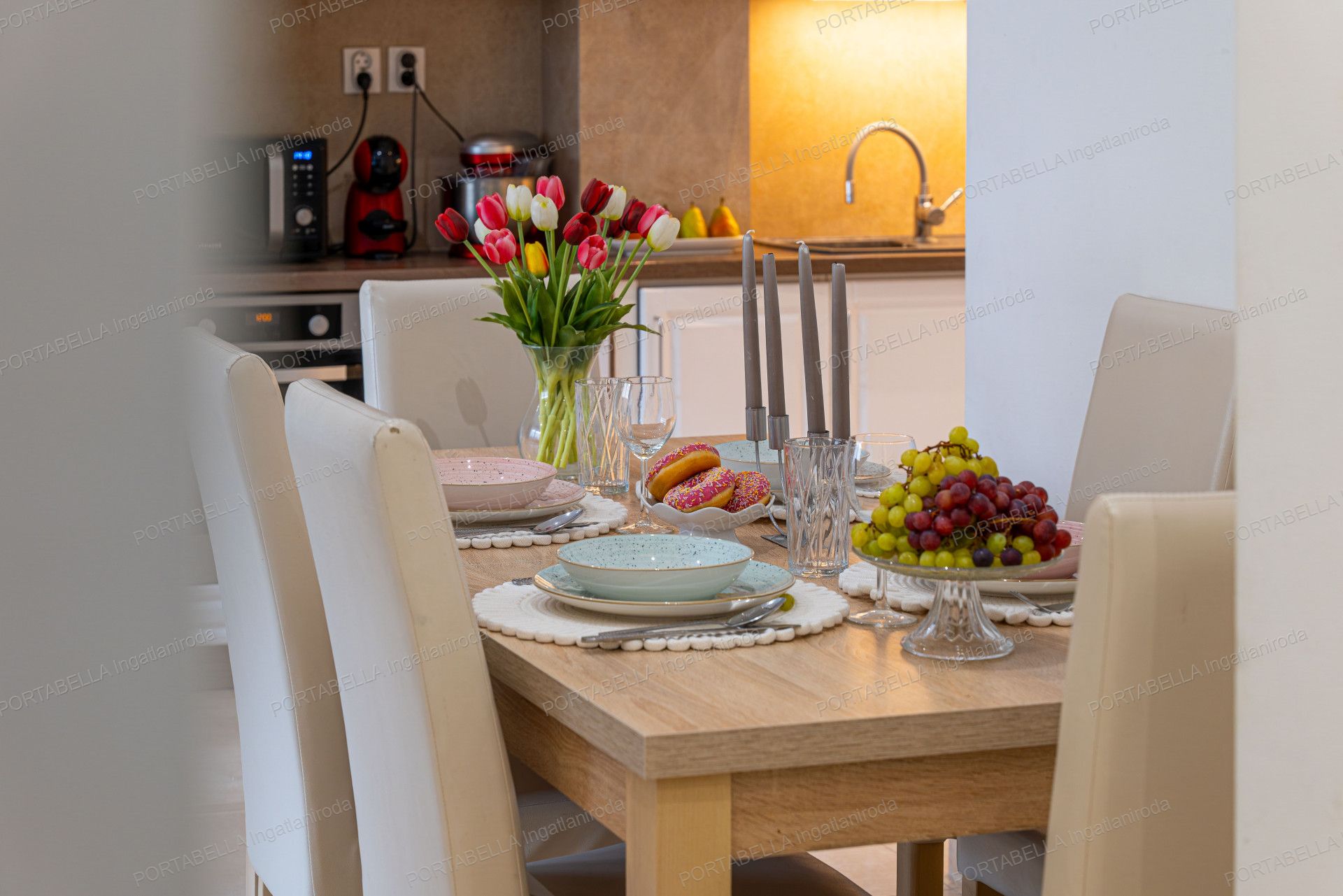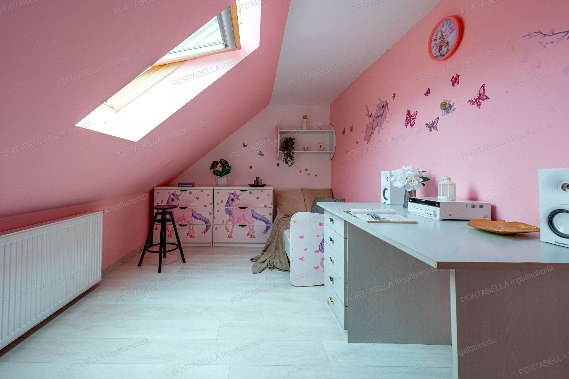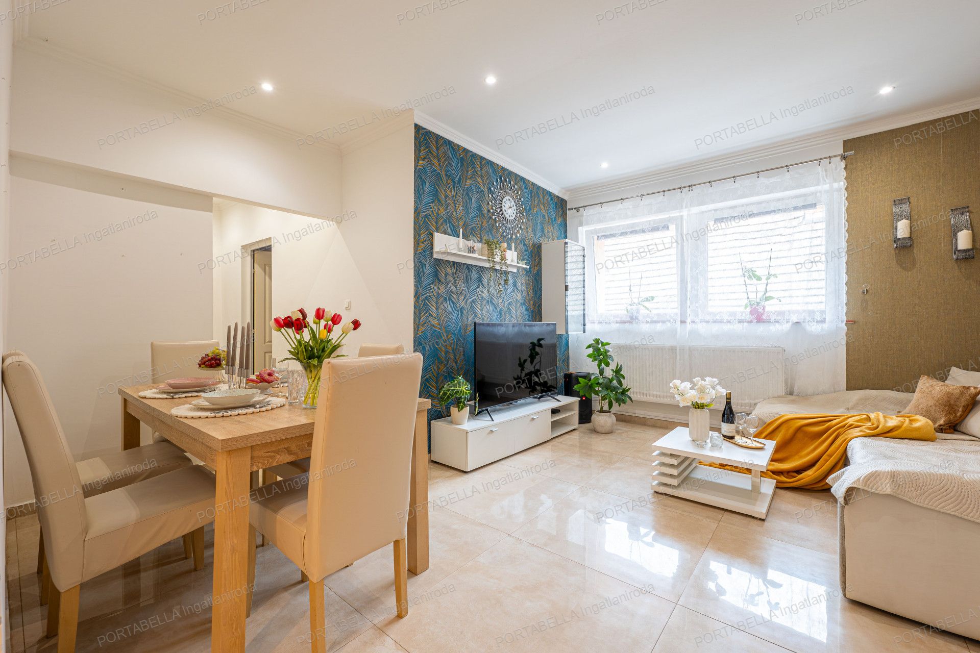 The spacious five-room property’s central feature is the open-plan living room with an American-style kitchen, offering a modern and attractive interior design suitable as a living, dining and social area.
