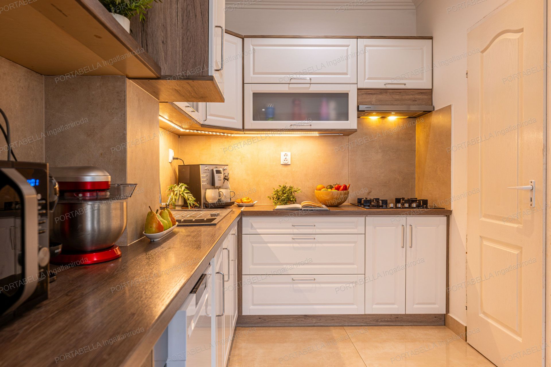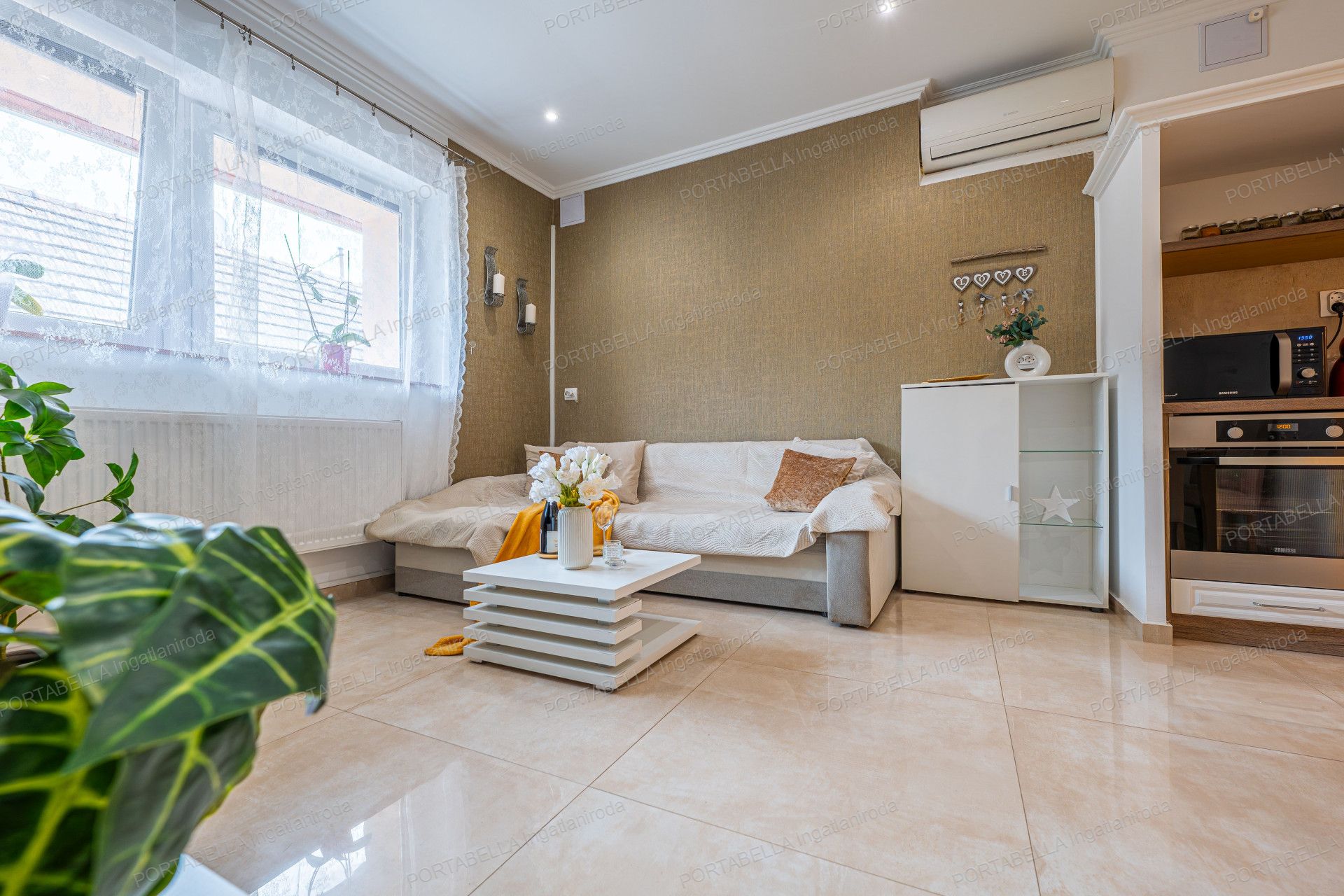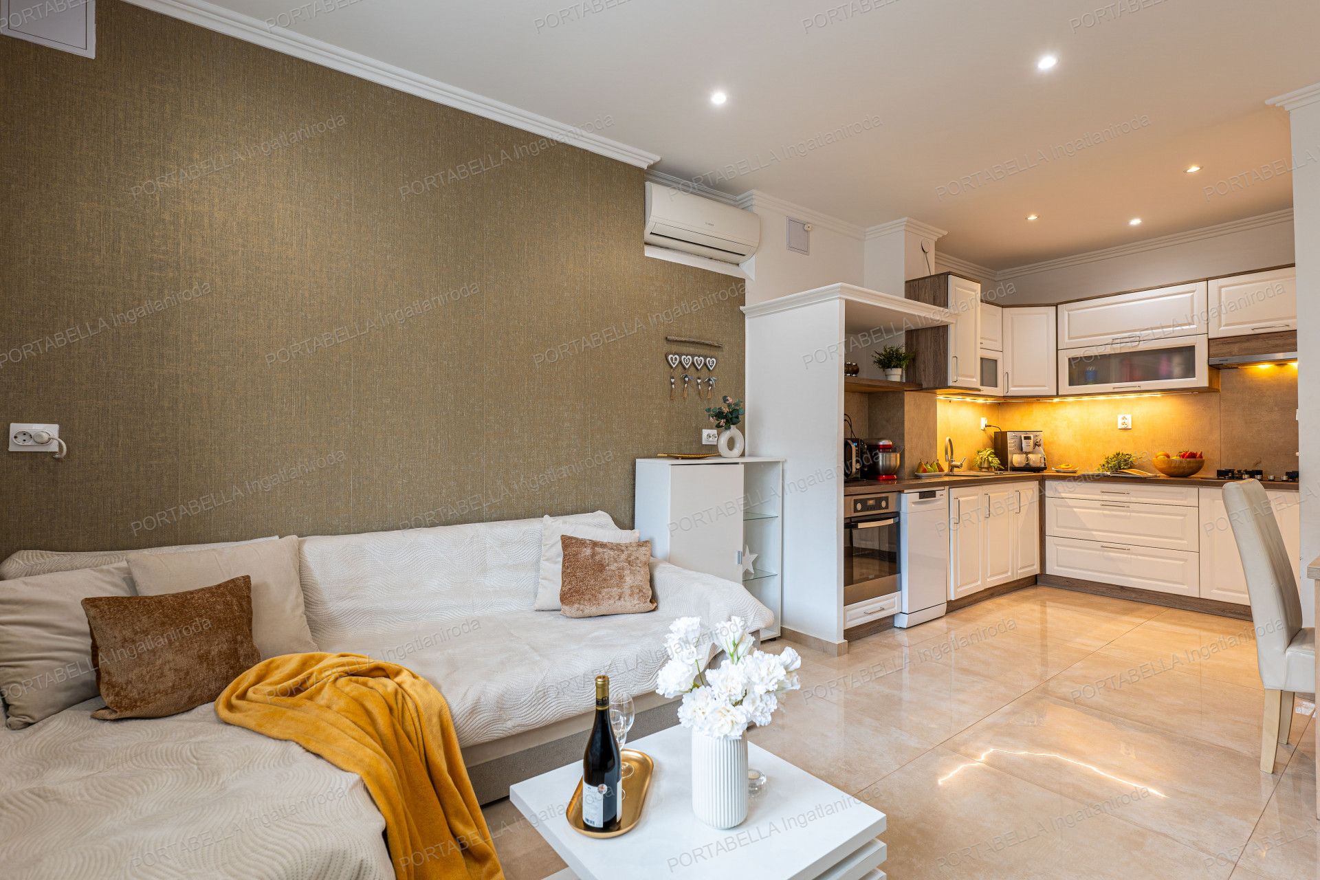 A tágas, 5 szobás ingatlan központi eleme az amerikai konyhás nappali, amely modern és esztétikus belső kialakítást kínál, alkalmas nappali-étkező- és közösségi térként egyaránt.