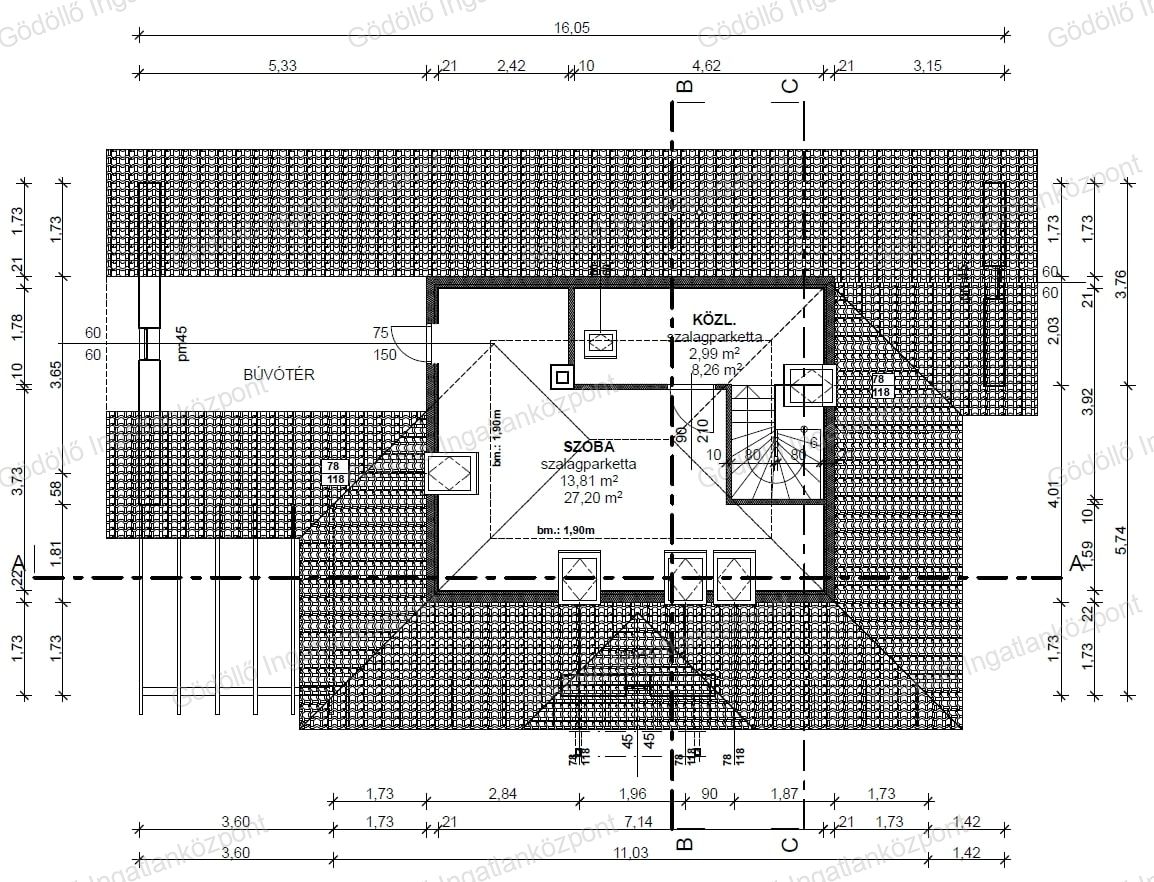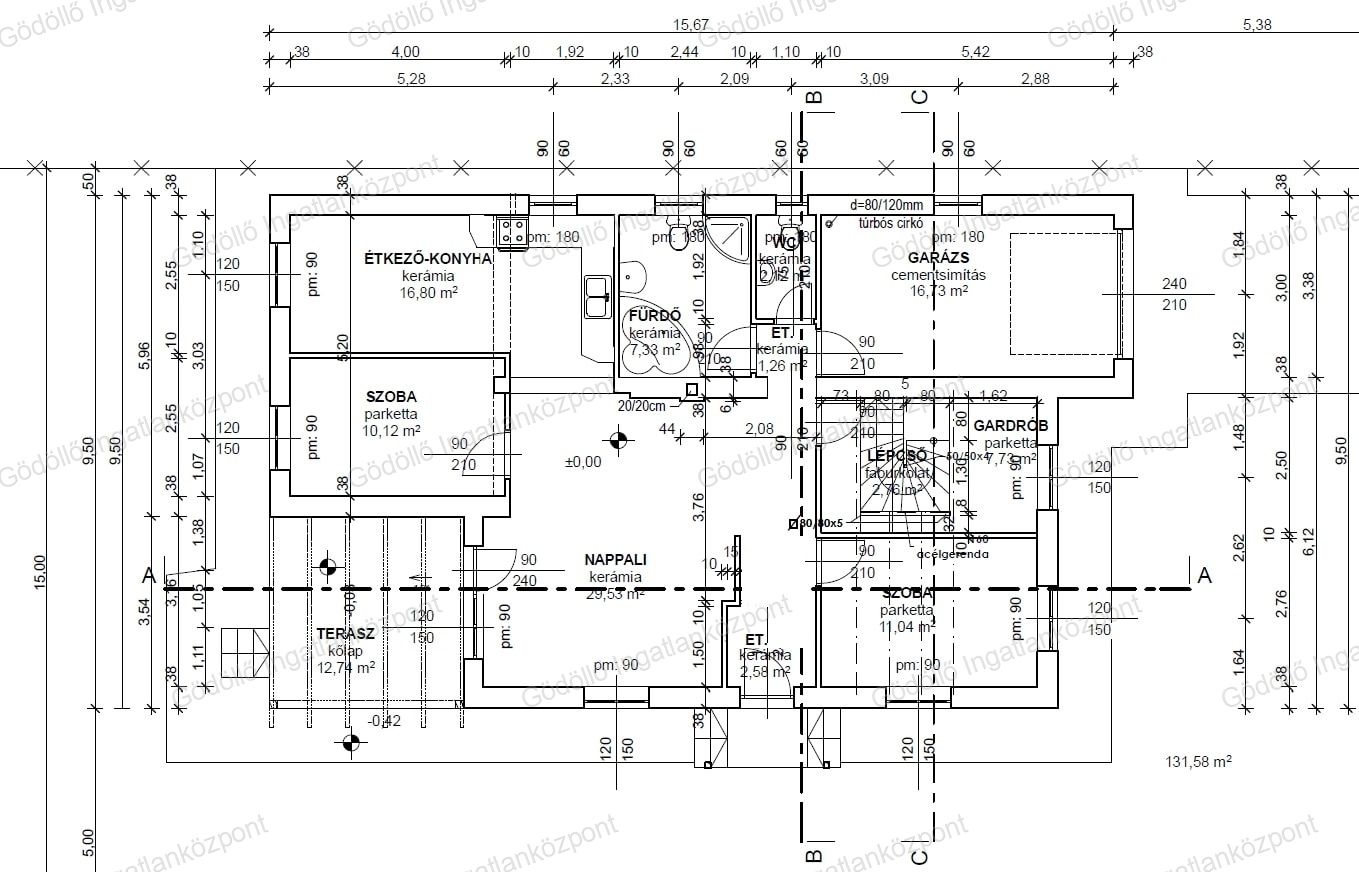 A nappaliból 12,74nm-es fedett terasz nyílik. Tetőtere 2013-ban lett átalakítva, 20cm vastag kőzetgyapottal és napelemmel ellátva.