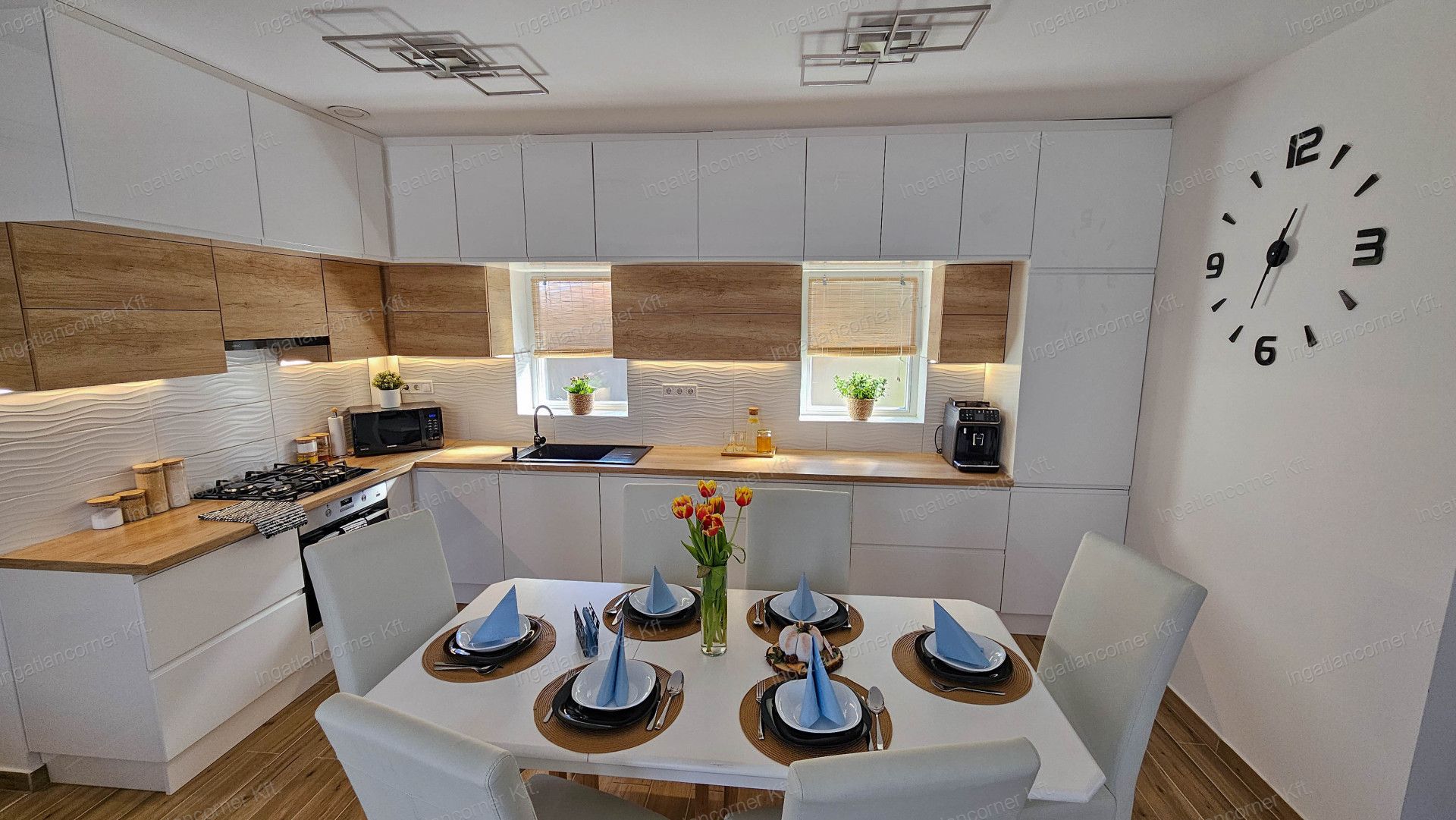 - Nappali -étkező -konyha, igényes, minőségi gépekkel ellátott konyhabútor( Hűtőszekrény, mosogatógép, főzőlap, sütő, elszívó berendezés)