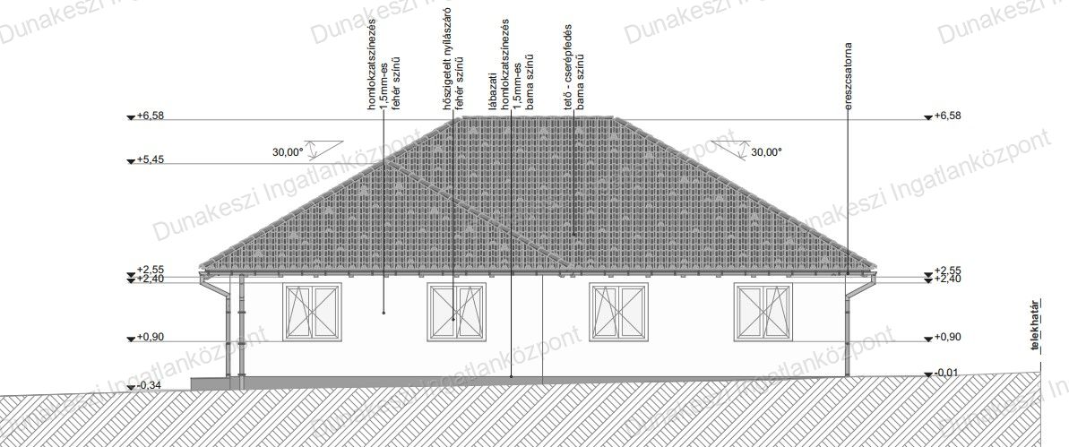 -Bramac, Római Novo típusú barna betoncseréppel van fedve, alatta pára áteresztő fóliával ellátva. Esővíz elvezetés bádogcsatornával a járda szintig, szikkasztó gödörbe belevezetve.