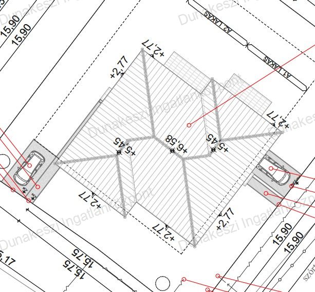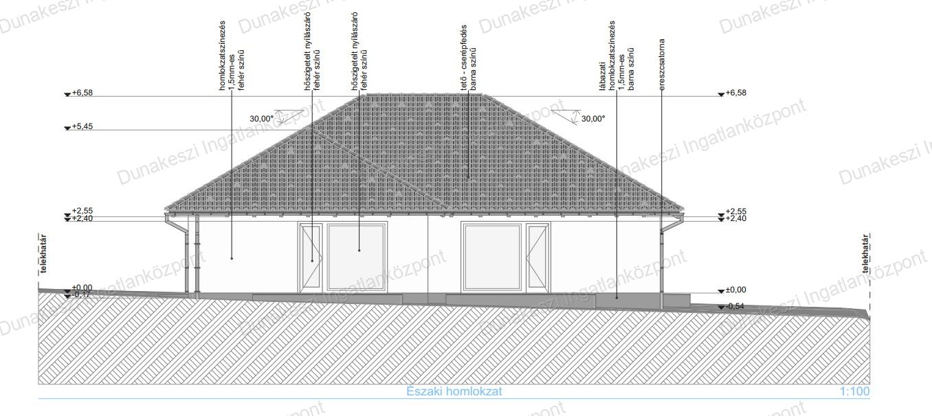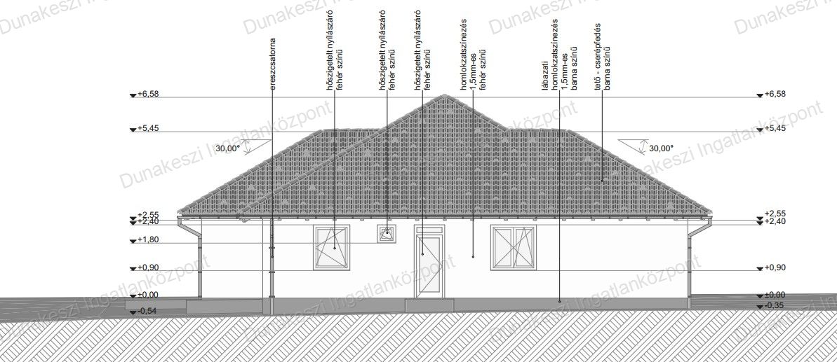-Bramac, Római Novo típusú barna betoncseréppel van fedve, alatta pára áteresztő fóliával ellátva. Esővíz elvezetés bádogcsatornával a járda szintig, szikkasztó gödörbe belevezetve.