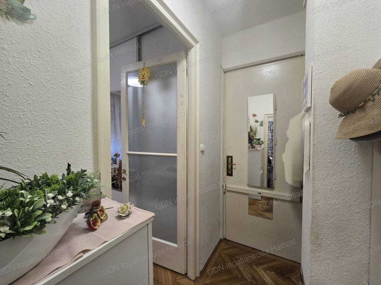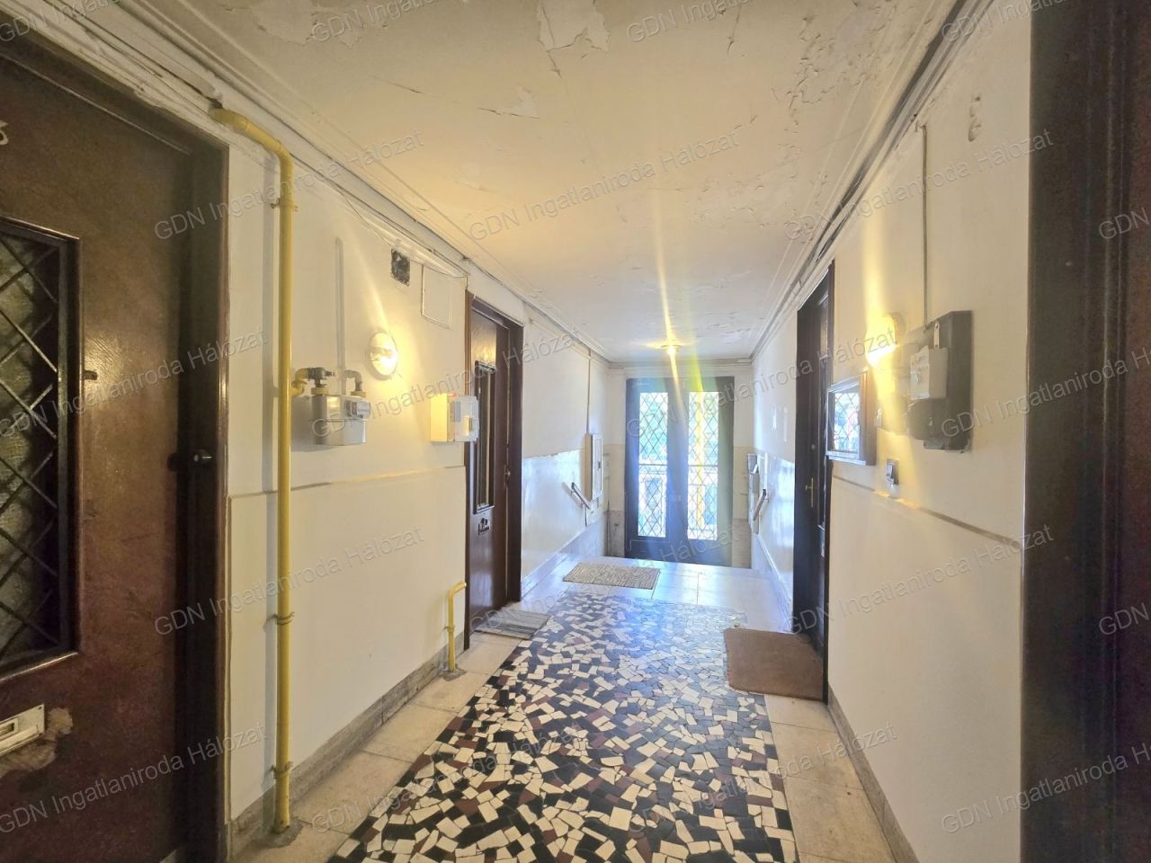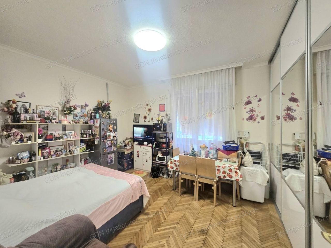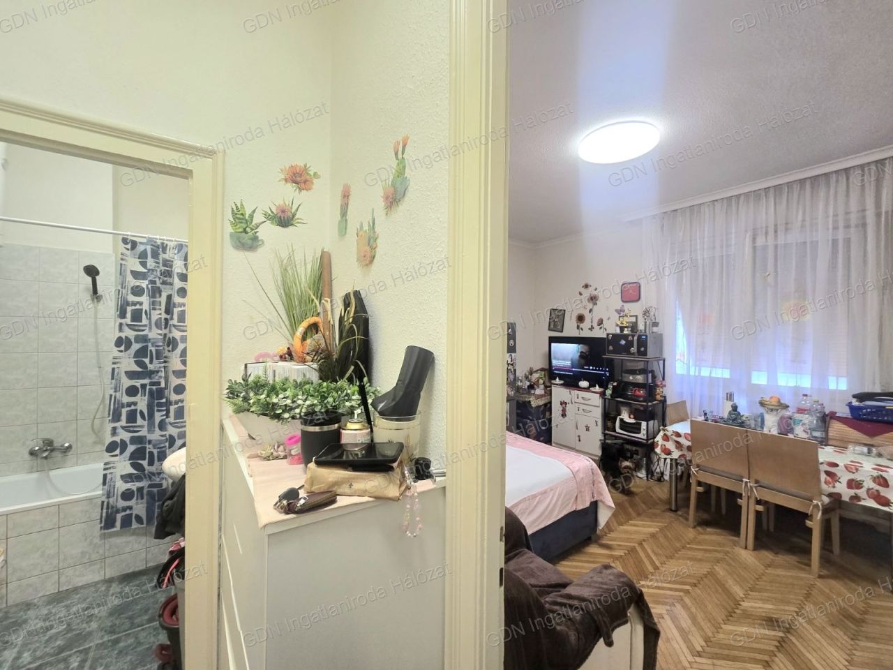 A nappali-háló tágas és világos, utcai kilátással, a házközponti fűtés pedig lapradiátorokon keresztül biztosítja a kellemes meleget a téli hónapokban.