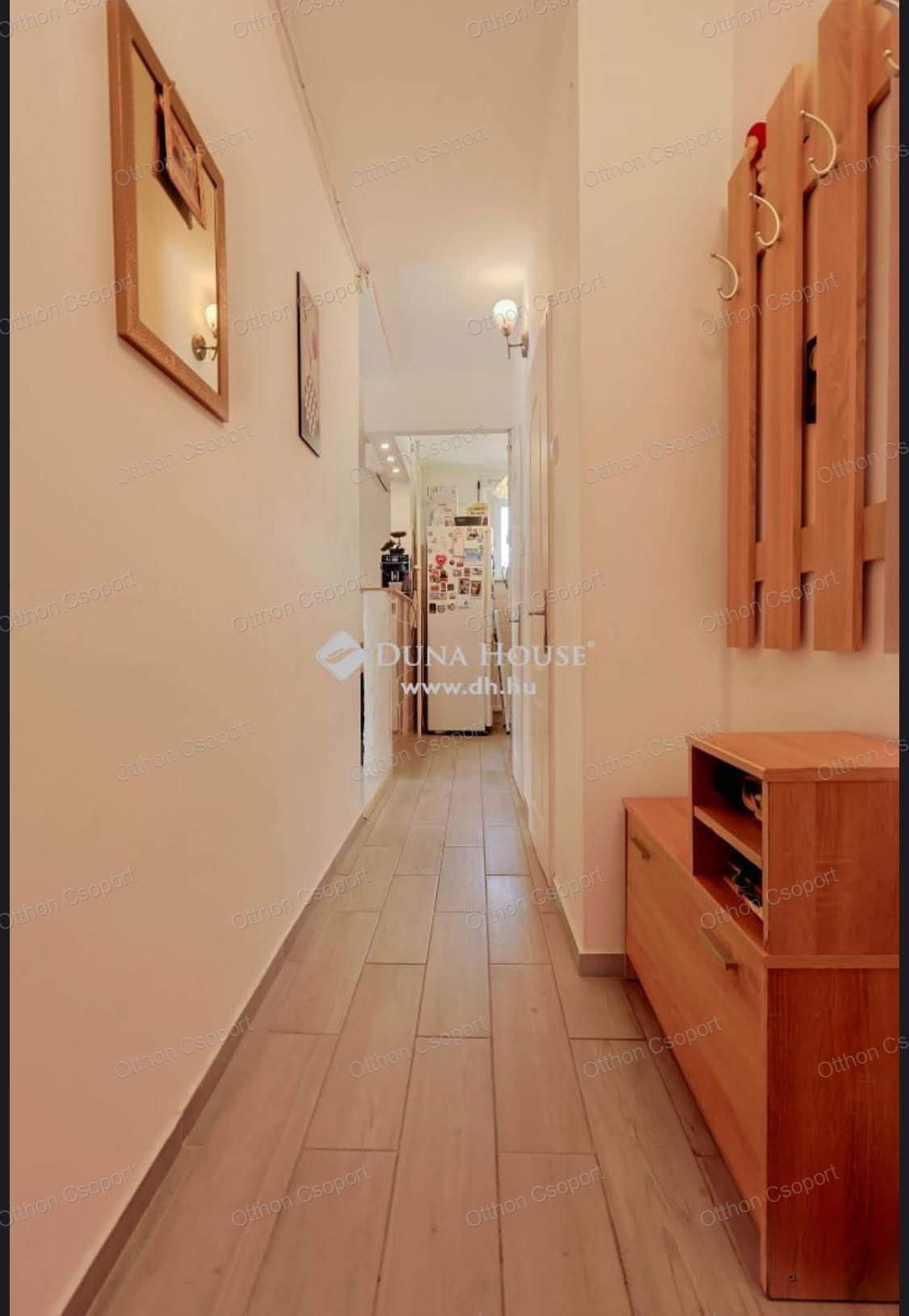 A közlekedő és a vizes helyiségek kerámia lappal burkoltak, a szobák laminált parkettával fedettek.