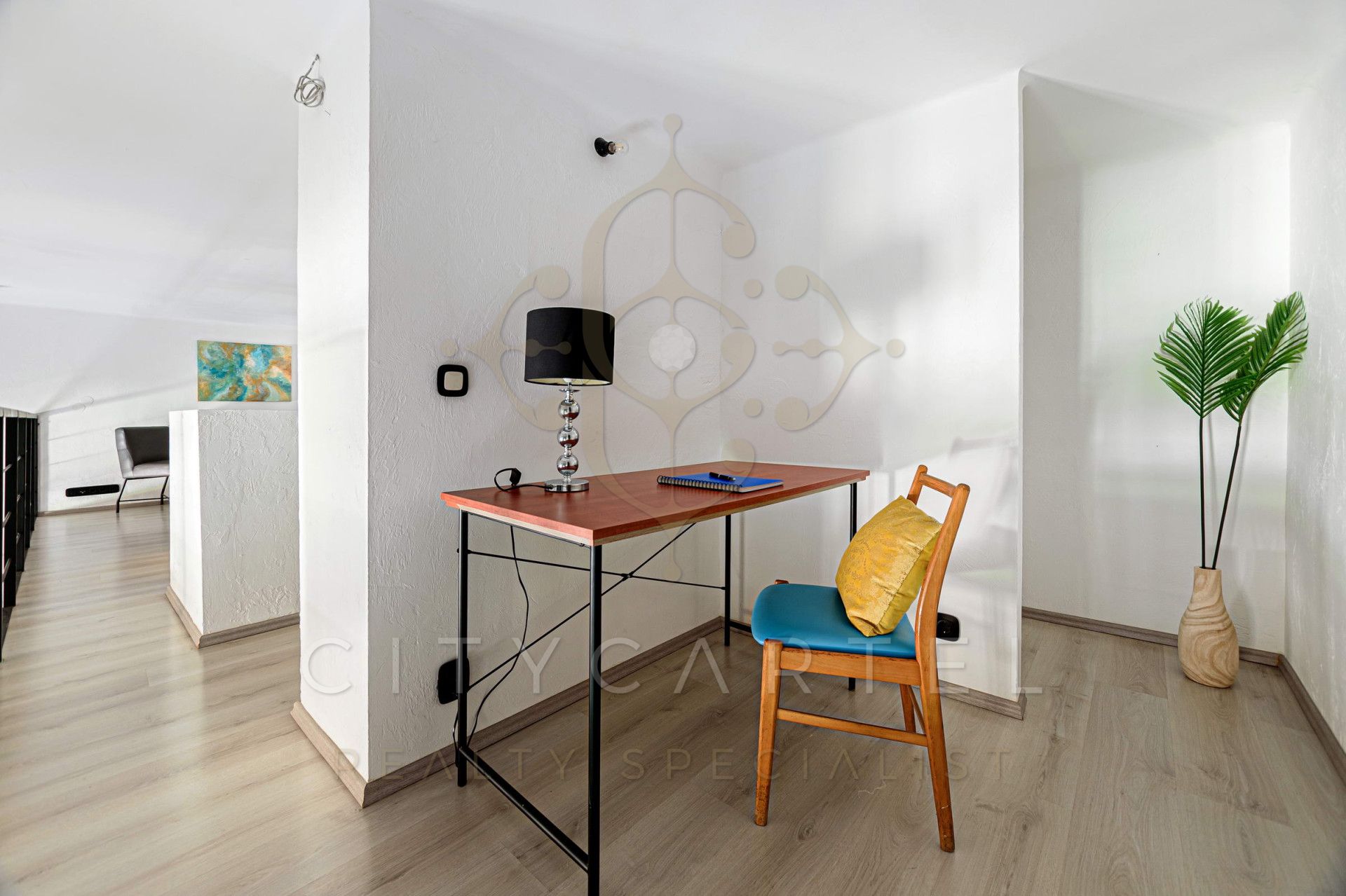 Az emeleten: tágas hálószoba és egy dolgozósarok, amely ideális home office-hoz vagy alkotómunkához.