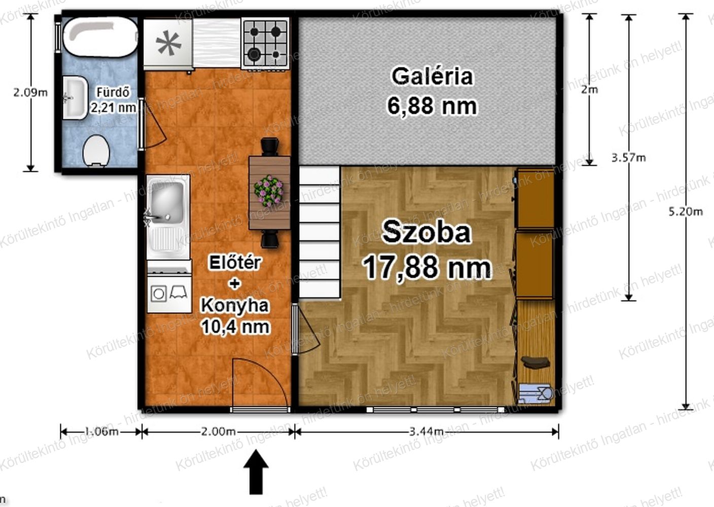 A konyhában (10,4nm), és a fürdőszobában (2,21 nm) járólap található, míg a szobában (17,88 nm) parketta.