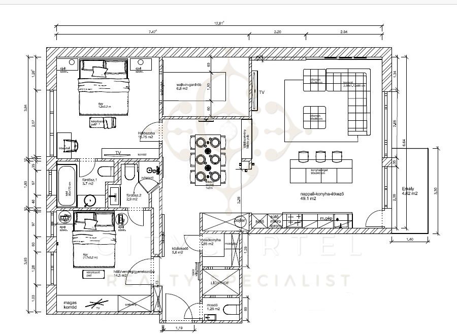 nappali, két kényelmes hálószoba, külön walk-in gardróbszoba, két elegáns fürdőszoba,