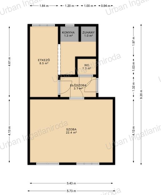 Elosztás: előszoba, ablakos konyha, szoba, zuhanyzó wc-vel külön helyiségben.