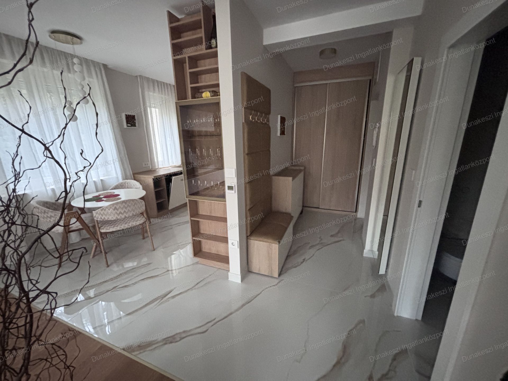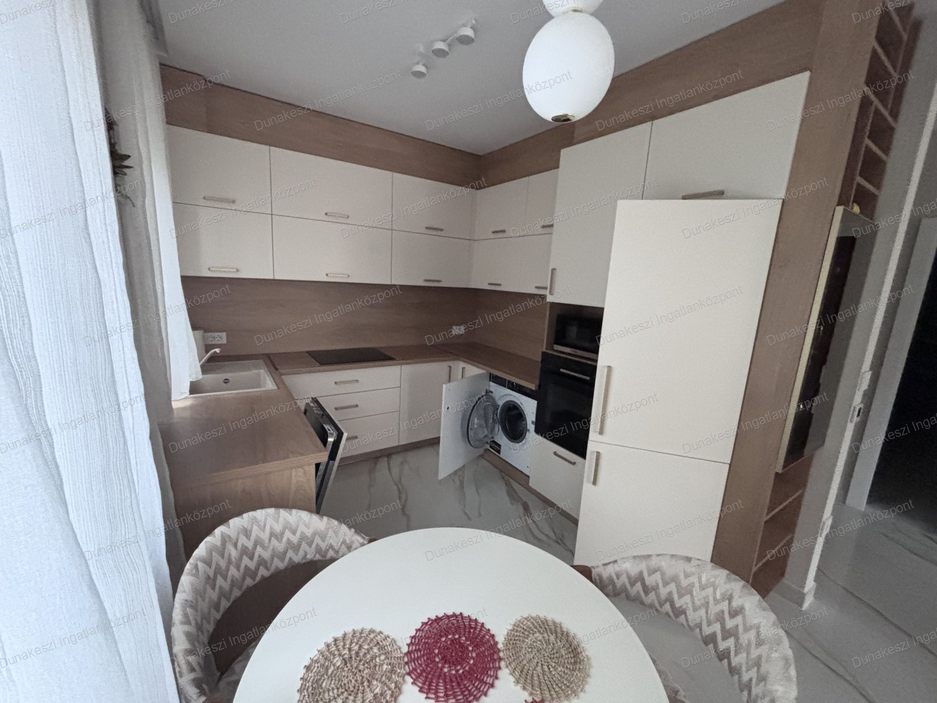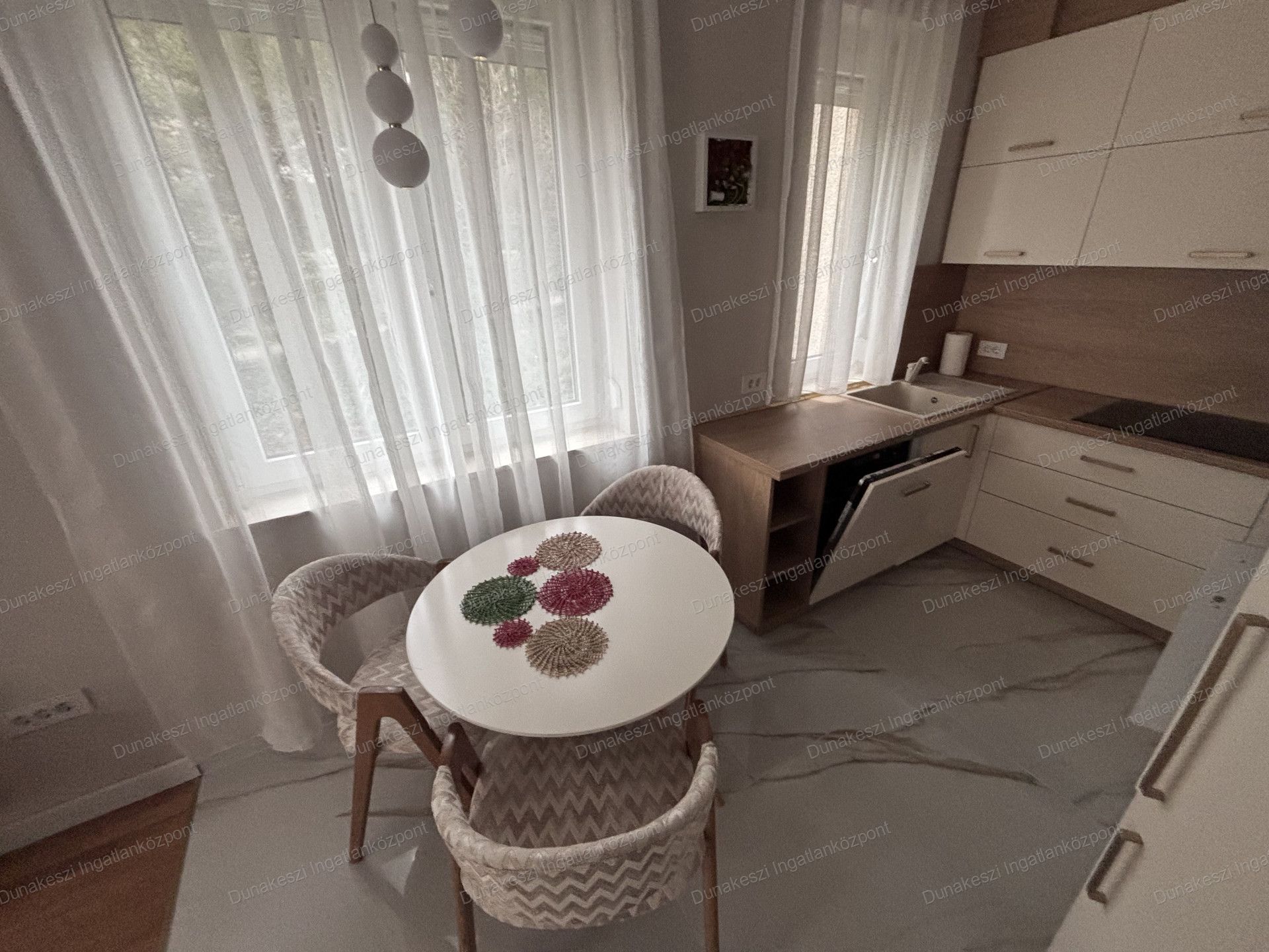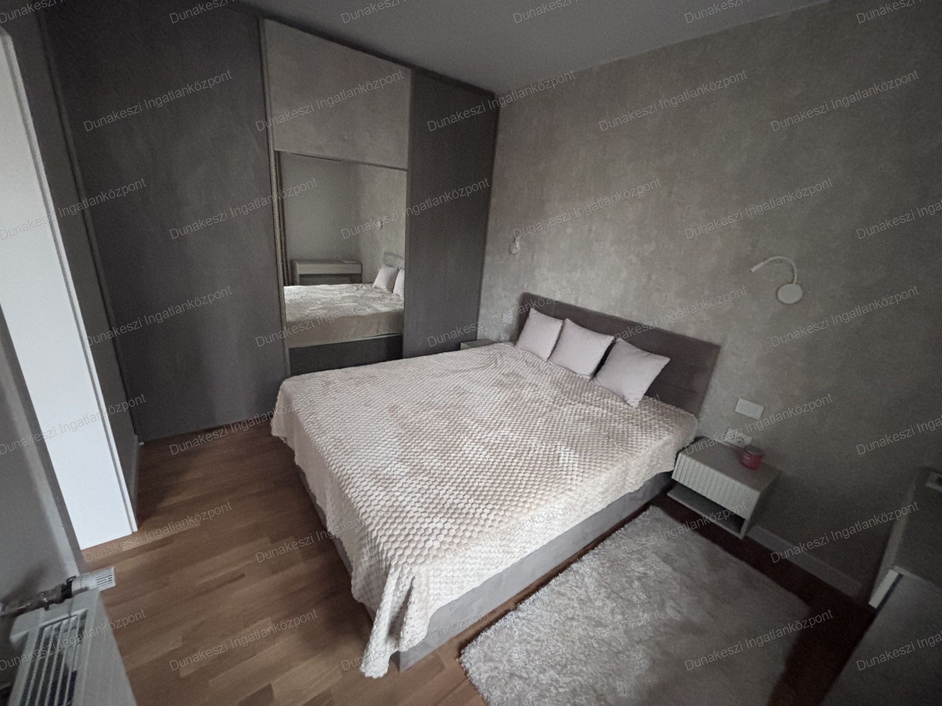 A lakás teljesen bútorozott, berendezett, beépített szekrények, franciaágy, ülőgarnitúra, étkező, tv szekrény tv-vel felszerelve.