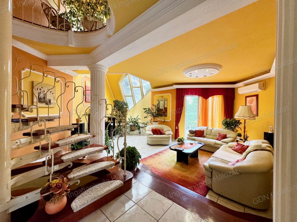 XVII. kerület közkedvelt városrészében, Madárdombon, kertvárosi környezetben, csendes aszfaltozott mellékutcában, 360 nm-es összközműves telken, 1989-ben épült, KIVÁLÓ ADOTTSÁGOKKAL RENDELKEZŐ, nettó 195 nm-es lakóterületű, 3 szintes, 5 szobás, (külön nyíló) dupla komfortos, ablakos konyhás, étkezős, tágas terekkel rendelkező, napos-világos, K-NY-i fekvésű, alacsony fenntartású, gázkazán fűtésű, a nappaliból közvetlen teraszkapcsolatos, jó állapotú, műanyag thermo ablakokkal szerelt, klimatizált, riasztórendszerrel felszerelt ikerház fél, beépített, gépesített konyhával, közvetlenül a házból megközelíthető fűtött garázzsal, mosókonyhával, hobby helyiséggel, finn szaunával, gondozott, öntözőrendszerrel kiépített kerttel eladó!