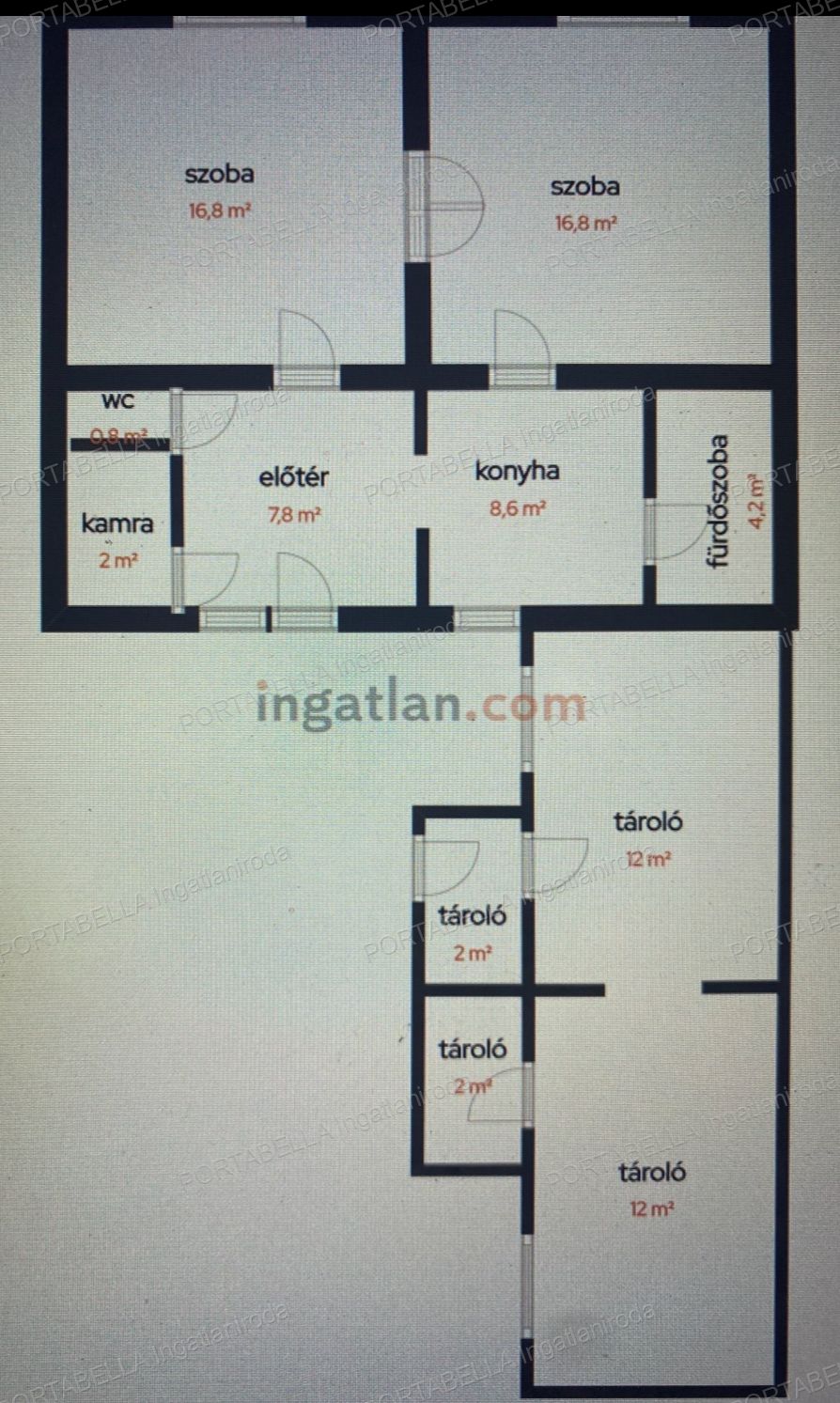 A ház a 1970-es években épült kocka-ház, 2 szoba, konyha, előszoba, spejz, fürdő, külön WC 57nm-en, hozzáépítve 28nm-es tároló, melyből további szobákat lehet kialakítani.