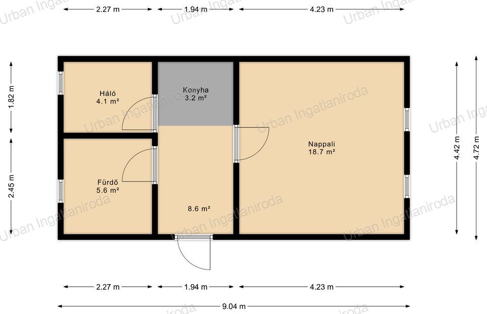 előszoba-konyha, két szoba, fürdő és wc egy helyisében.